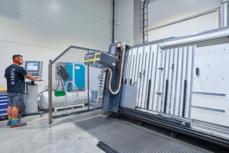 Um mehr Effizienz und Qualität in die Produktion zu bringen, setzt TRIPS auf integrierte Automatisierungslösungen bei der Schaltschrank-Bearbeitung, Kabelkonfektionierung und Anlagenprüfung. Störende Geräusche in der Halle durch Bohren und Fräsen? Fehlanzeige! Es herrscht konzentriertes, ruhiges Arbeiten an den Schaltanlagen. Die laute mechanische Bearbeitung der Schaltschränke wurde in einen separaten Fertigungsbereich „ausgelagert“. Mittels eines Perforex-Bearbeitungszentrums von Rittal werden dort Gehäuse sowie Flachteile automatisiert bearbeitet. „Mit der Perforex können wir bis zu 95 Prozent aller Bohr- und Fräsarbeiten automatisiert vornehmen“, so Lukasz Kowalski.